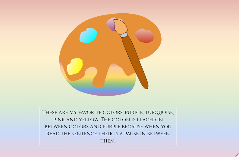 For writing I have learned about colons and how they work. We had a task to do that really made our brains think. Although I really enjoyed the task because I found it kind of easy. I found the first task easy because I could identify the pauses in sentences and that's how I knew where the colons were supposed to be. The second bit to this activity was to illustrate one of the sentences in the first activity. I decided that the last sentence was simple and easy for me to illustrate so I did that one. After that I have written a short description of how the colon was used in the sentence I chose.